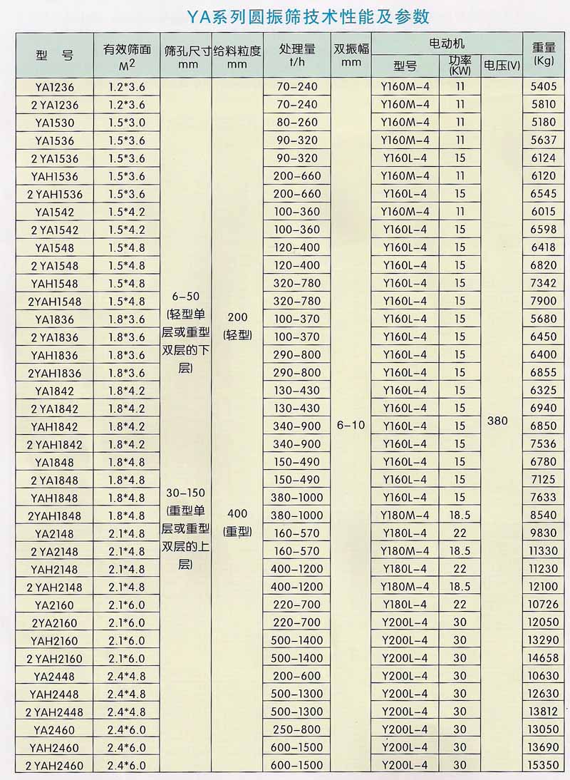 YA系列圓振篩是一種運動軌跡為圓的篩分設備,該機采用國外先進技術設計而成,具有技術參數先進,振動強度大,處理能力大,篩分效率高等特點,適合于選礦、選煤、建材、電力及化工等部門作物料分級使用。